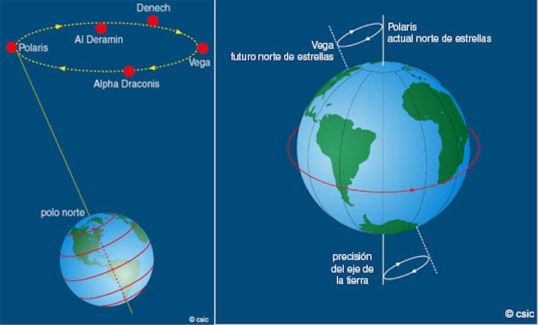 Pensemos en la estrella Polar. Ahora marca (casualmente) aproximadamente el Norte, pero eso no será así siempre. Dentro de unos milenios el Norte lo marcará Vega. Ese movimiento se conoce como precesión de los equinoccios.