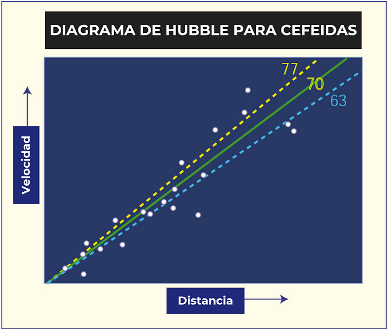 Así, en la gráfica superior, el mejor ajuste lineal a los datos arroja un valor de 70 kilómetros/segundo/megapársec, donde 1 megapársec (Mpc) equivale a unos 30 trillones de kilómetros. Esto significa que una galaxia situada actualmente a 1 Mpc de distancia se alejaría de nosotros a una velocidad de 70 km/s.