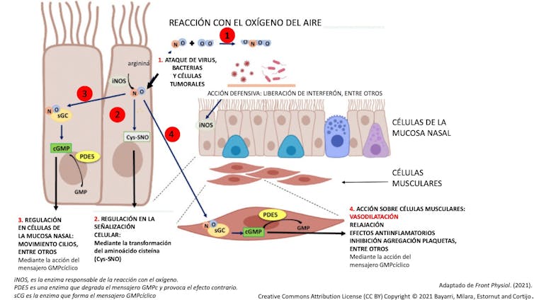 Otra razón para respirar por la nariz es el óxido nítrico (NO), un vasodilatador que se produce en las células epiteliales de la cavidad nasal al pasar el aire. Se sabe que el óxido nítrico, entre otras funciones, participa en los procesos de inflamación crónica y en la modulación de la función pulmonar. Y también es un potente vasodilatador que se difunde muy rápidamente, consiguiendo una apertura mayor de las vías respiratorias.