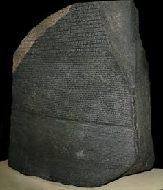 La piedra de Rosetta contiene un solo texto, escrito en tres sistemas de escritura diferentes, separados en tres registros. El primero está escrito en griego, el segundo en egipcio, con jeroglíficos, y el tercero en escritura demótica, también en lengua egipcia.