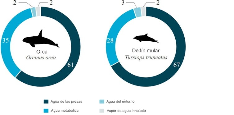 Los resultados isotópicos obtenidos y los del modelo indican que el agua de presa es la principal fuente de ingesta de agua para orcas y delfines mulares (61-67 % de la ingesta total), seguida del agua metabólica (28-35 % de la ingesta total). La producción de agua metabólica fue significativamente mayor en las orcas cuya dieta es más rica en lípidos. El resto es agua de mar circundante ingerida accidentalmente y vapor de agua inhalado durante la respiración.