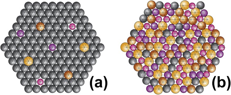 Pero en 2004 todo cambio. Dos grupos de investigación, encabezados por Brian Cantor y Jien-Wei Yeh (de forma simultánea y en lugares distintos, algo muy usual en grandes hitos científicos), descubrieron y demostraron que si la entropía de la mezcla es suficientemente alta, por encima de un valor determinado, se pueden conseguir aleaciones de una única fase sencilla donde los átomos ocupan los distintos lugares del cubo de forma indistinta.