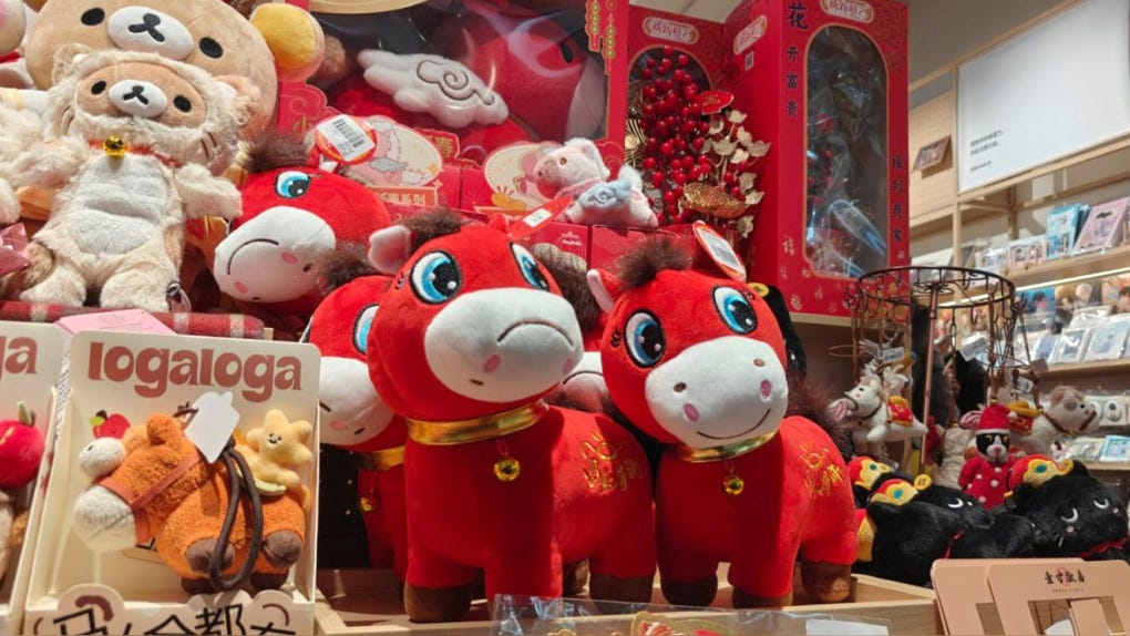 Como cada Año Nuevo Lunar, el animal del ciclo se convierte en protagonista del merchandising y la cultura pop. En 2026, un caballo de peluche cuya sonrisa fue cosida al revés —dándole un gesto compungido— se volvió viral en redes sociales y disparó sus ventas.