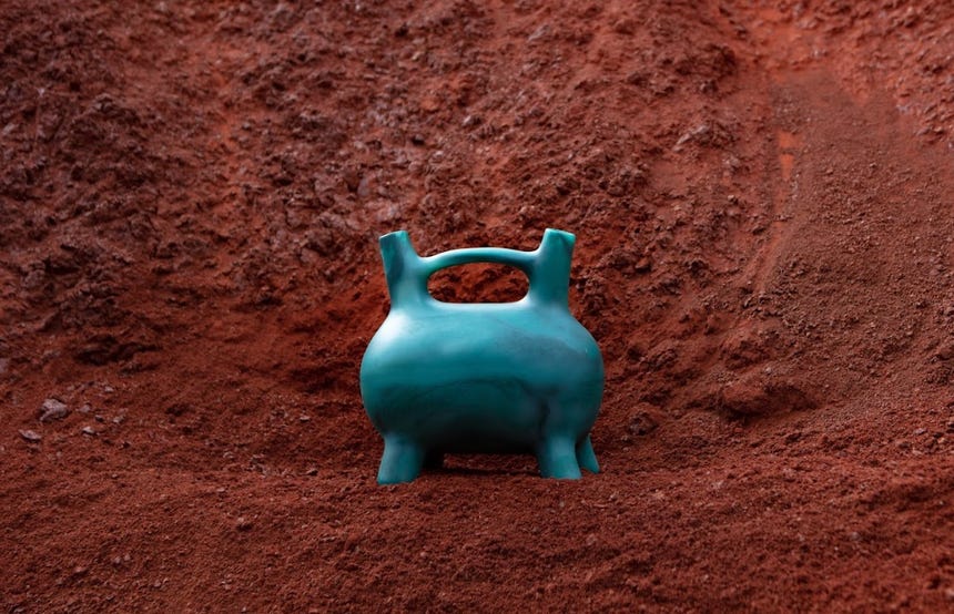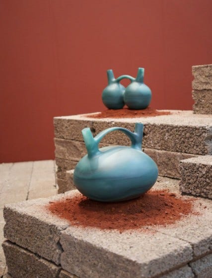 Cada objeto reinterpreta la cerámica VICÚS desde su lógica geométrica, su simetría y su carácter escultórico. Las proporciones arcaicas se transforman en presencias depuradas donde la transparencia dialoga con la densidad simbólica de las formas. La paleta cromática turquesa, tierra, carbón y ocre- remite a pigmentos naturales y a la dimensión ceremonial del color, estableciendo un vínculo directo con los códigos visuales de las culturas originarias.