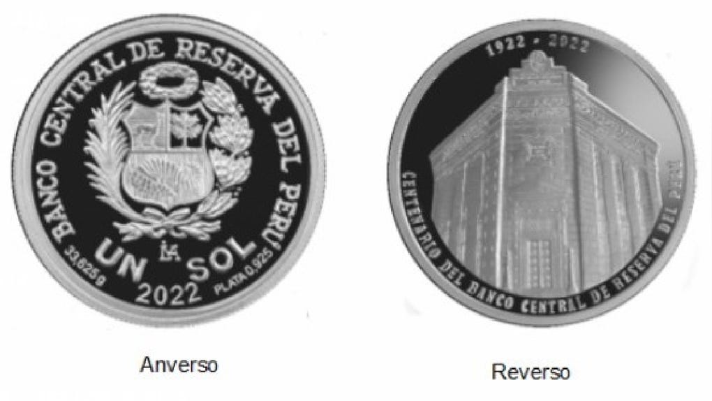 Además, en la parte inferior de la moneda se muestra el texto "Centenario del Banco Central de Reserva del Perú" y en la parte superior "1922-2022".