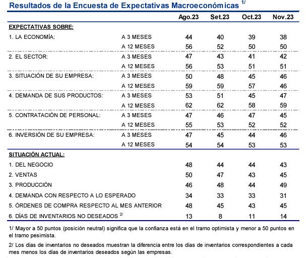 Los resultados de la Encuesta de Expectativas Macroeconómicas del Banco Central de Reserva que corresponde a noviembre no revelan que las expectativas a futuro de las empresas hayan mejorado, sobre todo en los siguientes tres meses.