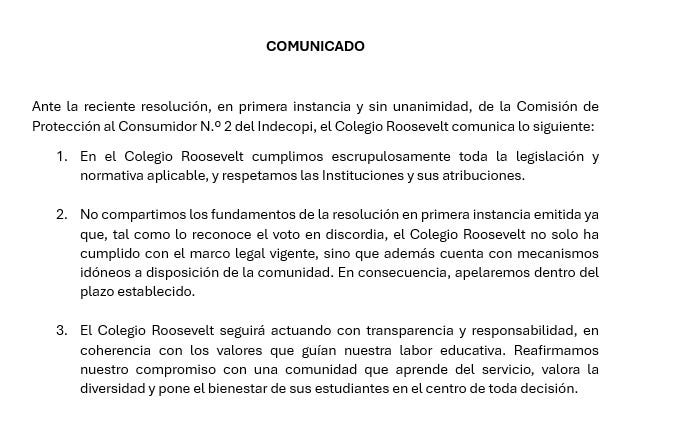 El Colegio Roosevelt respondió a la resolución en primera instancia de la Comisión de Protección al Consumidor N.º 2 del Indecopi, señalando que cumple estrictamente con toda la legislación vigente y respeta las instituciones y sus atribuciones.