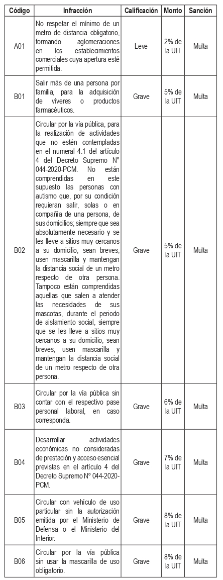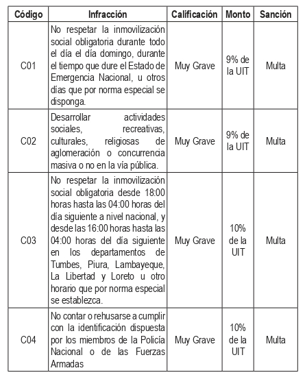 La multas por infracciones consideradas muy graves son S/387 y se dan por no respetar la inmovilización social de los domingos, o desarrollar actividades sociales y/o recreativas.