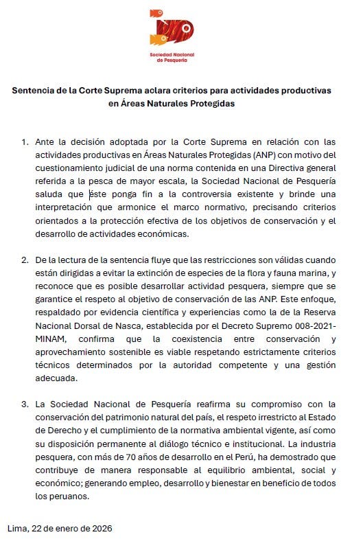 La Sociedad Nacional de Pesquería saludó la decisión, al considerar que pone fin a la controversia legal y brinda reglas claras para compatibilizar la conservación ambiental con el desarrollo económico. El gremio destacó que existen experiencias exitosas, como la Reserva Nacional Dorsal de Nasca, donde la pesca sostenible ha coexistido con la protección del ecosistema bajo criterios técnicos y respaldo científico.