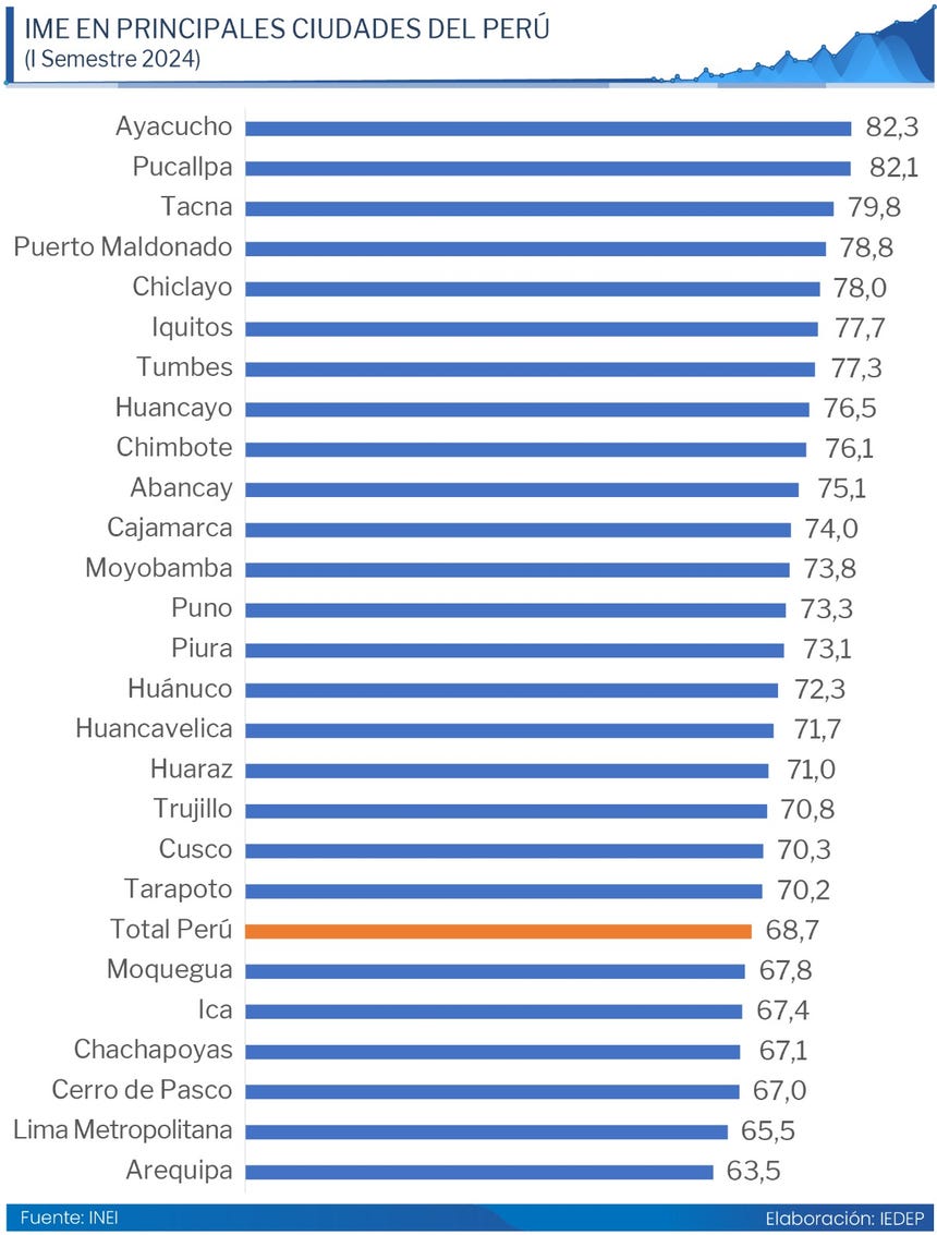 En 2023, el IME nacional fue de 68.9 puntos y, entre las cinco ciudades con mayor índice, se ubicaron Ayacucho (81.0), Chiclayo (80.7), Tacna (80.1), Pucallpa (79.9) y Tumbes (79.5).