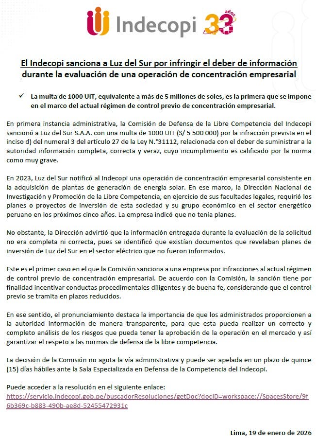 En relación con la sanción impuesta en primera instancia, Luz del Sur indicó que esta responde a una diferencia de criterios sobre la información entregada durante un proceso de adquisición realizado en 2023. Según explicó, mientras el Indecopi consideró que se omitió información referida a “planes de inversión”, la empresa precisó que, en ese momento, se encontraba realizando evaluaciones de oportunidades que no habían sido aprobadas ni consolidadas como planes de inversión bajo sus estándares de gobernanza.