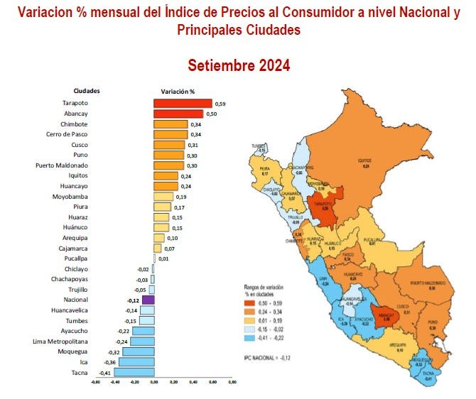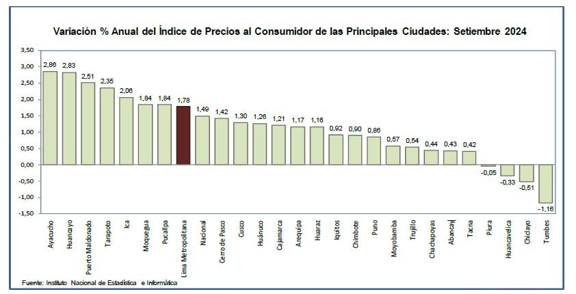 Aunque, en el periodo comprendido entre octubre 2023 y septiembre 2024, la ciudad que muestra una tasa superior al 2.00 % es Ayacucho con 2.86%. Otras donde crecieron los precios son: Huancayo 2.83 %, Puerto Maldonado 2.51 %, Tarapoto 2.35 % e Ica 2.06 %.