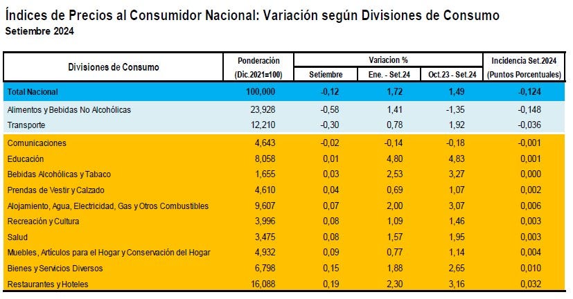 Esta baja se debe a una reducción en el precio de los Alimentos y Bebidas No Alcohólicas (-0.97 %) y Transporte (-0.40 %), que en conjunto aportaron negativamente en -0.29 puntos porcentuales a la variación del índice general (-0.24 %); así lo informó el INEI.
