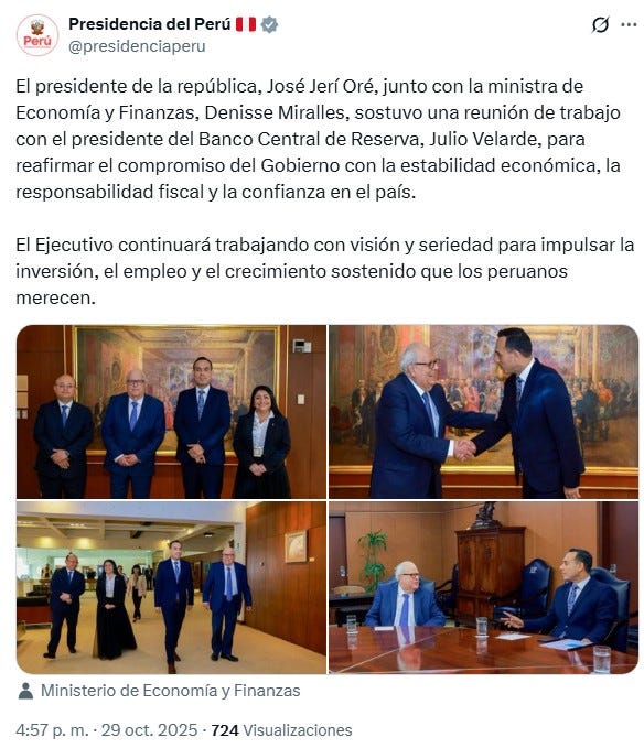 El presidente de la república, José Jerí Oré, sostuvo una reunión con líderes relacionados con las finanzas del país, como la ministra de Economía y Finanzas, Denisse Miralles, se reunió con el presidente del Banco Central de Reserva (BCR), Julio Velarde, en un encuentro para reafirmar las prioridades del Ejecutivo.