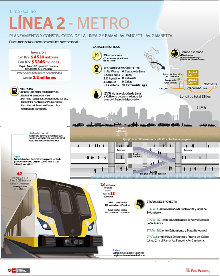 Ya hay fecha. La Línea 2 del Metro de Lima y Callao empezaría a operar en febrero del 2021, con el tramo de Mercado Santa Anita – Evitamiento. Así lo confirmó la ministra de Transportes y Comunicaciones, María Jara.