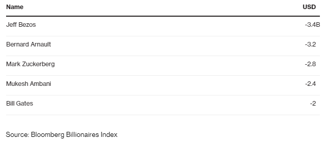 Entre los otros perjudicados están Bernard Arnault, segundo hombre más adinerado del mundo y dueño del grupo empresarial que maneja la marca Louis Vuitton, perdió US$3.2 mil millones; Mark Zuckerberg, fundador de Facebook, sufrió pérdidas de US$2.8 mil millones; Mukesh Ambani, presidente del conglomerado indio Reliance Industries, perdió $2.4 mil millones; y Bill Gates, dueño de Microsoft, tuvo pérdidas que ascendieron a $2 mil millones.