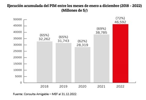 "A nivel desagregado, el Gobierno Nacional finaliza el año con una ejecución de 91 % del PIM, confirmando que las unidades ejecutoras de este nivel ejecutaron casi el total de su presupuesto asignado; a su vez, los gobiernos regionales cierran el 2022 ejecutando el 63% y los gobiernos locales el 67%, del total de su presupuesto programado para la inversión pública", indicó.