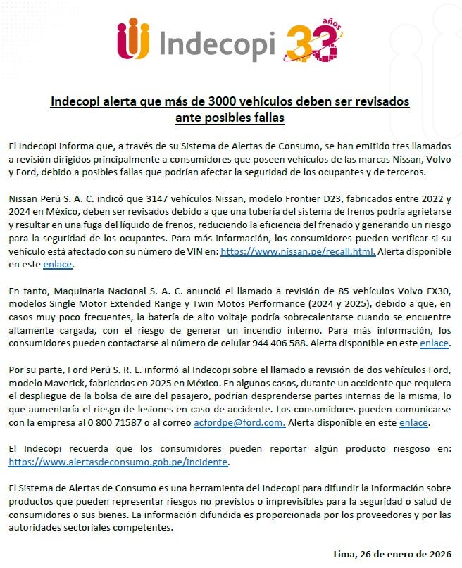 Más de 3,000 vehículos de las marcas Nissan, Volvo y Ford fueron llamados a revisión por posibles fallas que comprometen la seguridad. Indecopi alertó sobre riesgos en el sistema de frenos, baterías y bolsas de aire, e instó a los propietarios a verificar si sus unidades están afectadas y acudir a los canales oficiales.