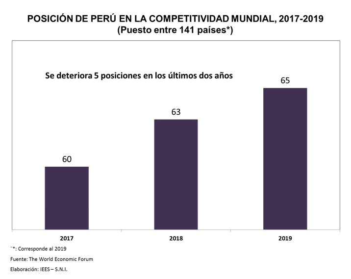 Perú ocupa el puesto 65 entre 141 economías evaluadas en por el Ranking Global de Competitividad 2019 del Foro Económico Mundial.