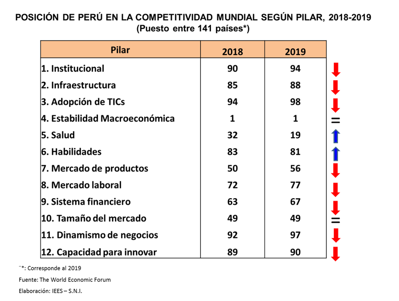 Las estadísticas del Foro Económico Mundial indican que de los 12 pilares que muestra el índice de competitividad, nuestro país registra un deterioro en ocho: Institucionalidad, Infraestructura, Adopción de TICs, Mercado de Productos, Mercado Laboral, Sistema Financiero, Dinamismo de Negocios y Capacidad para innovar.