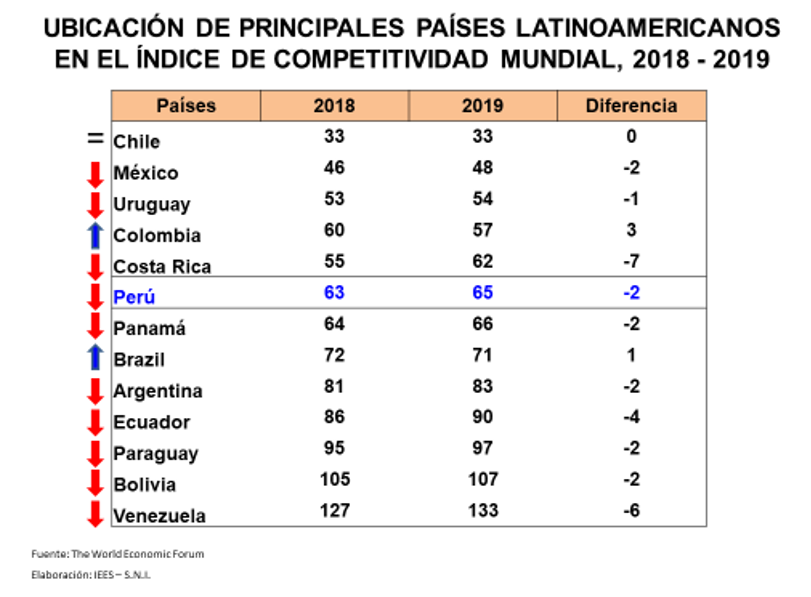 Sin embargo, el país mantiene el sexto lugar en Latinoamérica (entre 18 países), posición similar a la registrada en el ranking del 2018, ubicándose luego de Chile (puesto 33), México (puesto 48), Uruguay (puesto 54), Colombia (puesto 57) y Costa Rica (puesto 62).