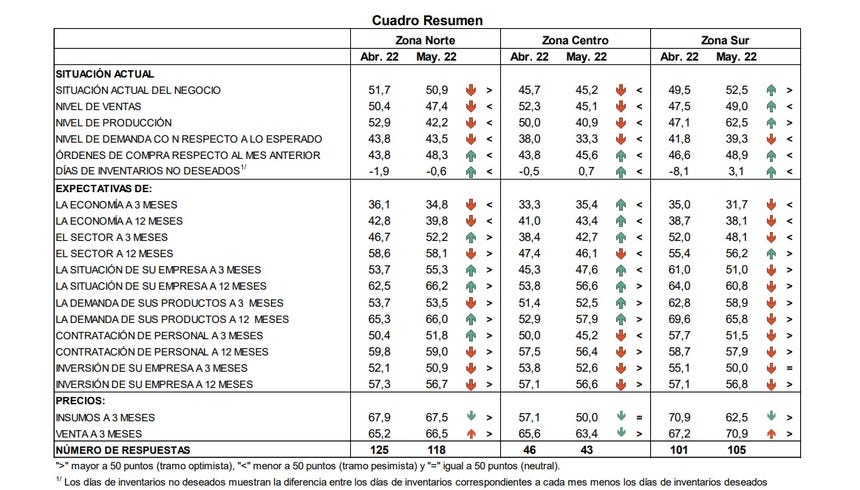 "Se aprecia un deterioro de la mayoría de los indicadores de situación actual en las zonas norte y centro; y mejoras en la zona sur, respecto al mes anterior. Por su parte, todos los indicadores de expectativas se deterioran en la zona sur (excepto sector a 12 meses); mientras que las zonas norte y centro presentan resultados mixtos", se lee en el reporte. (Ver cuadro)