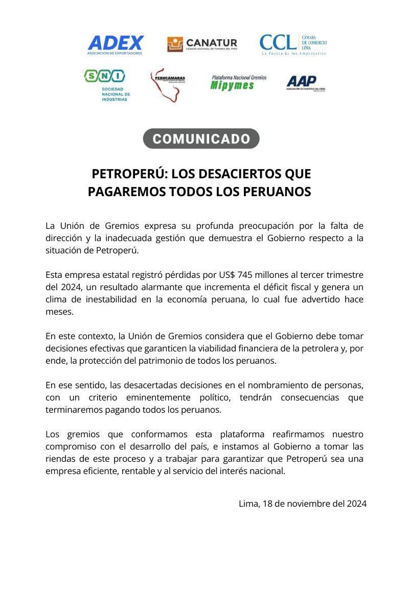 "La Unión de Gremios expresa su profunda preocupación por la falta de dirección y la inadecuada gestión que demuestra el Gobierno respecto a la situación de Petroperú", se puede leer en el documento al iniciar.