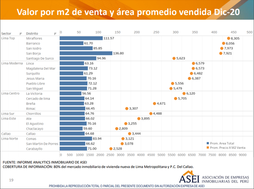 El valor promedio por metro cuadrado (m2) de venta en Lima Metropolitana en el 2020 se ubicó en S/ 6,009. Lo que representa un incremento de de 7%