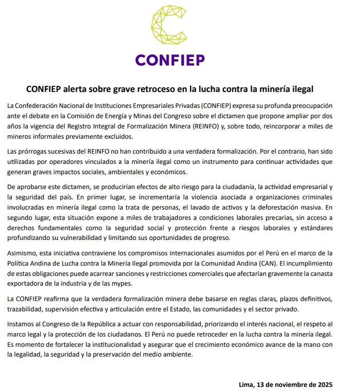 La Confederación Nacional de Instituciones Empresariales Privadas (Confiep) emitió un comunicado manifestando su "profunda preocupación" ante un dictamen que se debate en la Comisión de Energía y Minas del Congreso de la República, advirtiendo que, de aprobarse, implicaría un "grave retroceso en la lucha contra la minería ilegal".
