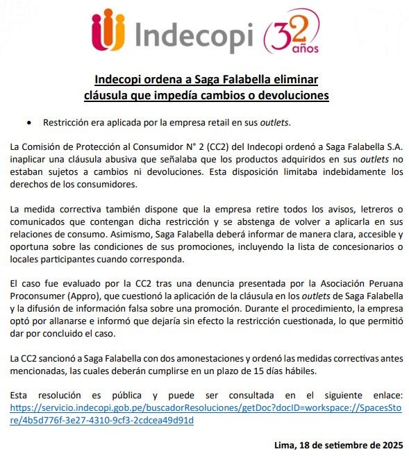 Indecopi ordenó a Saga Falabella S.A. dejar sin efecto una cláusula abusiva que prohibía cambios o devoluciones en outlets. La empresa recibió dos amonestaciones y deberá retirar toda restricción similar, además de informar con claridad las condiciones de sus promociones en adelante.