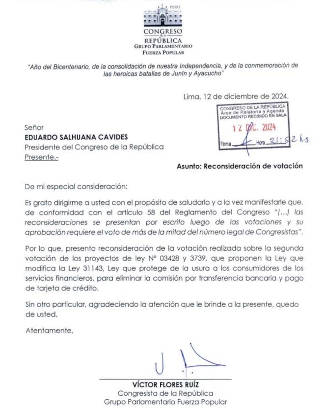 El pedido de reconsideración fue presentado por Víctor Flores Medina, el congresista de la bancada Fuerza Popular.