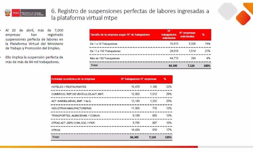 Al 20 de abril, un total de 7,124 empresas solicitaron suspension perfecta de labores en la plata forma virtual del Ministerio de Trabajo.