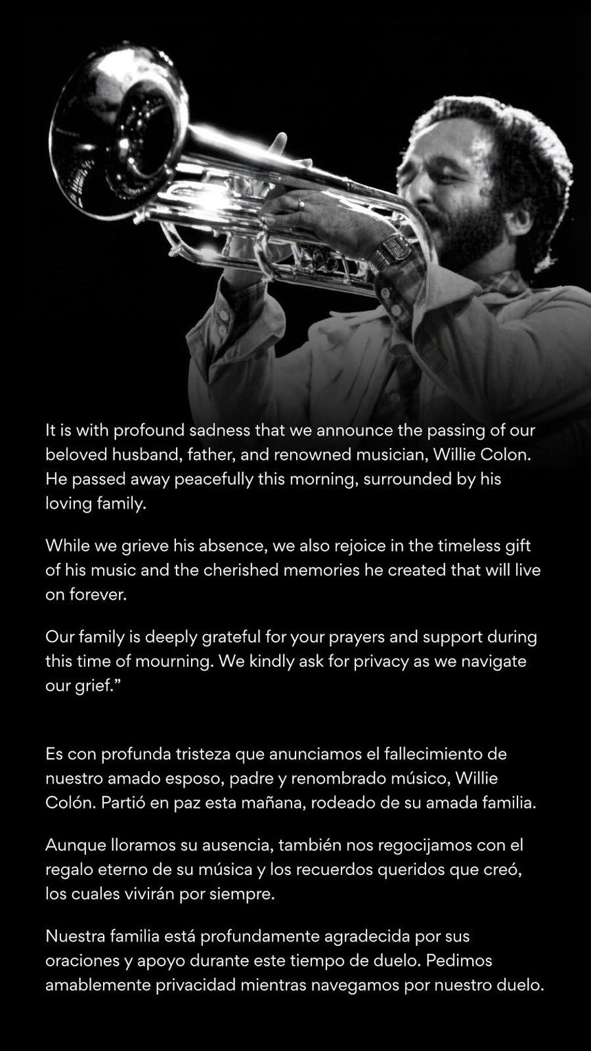 "Es con profunda tristeza que anunciamos el fallecimiento de nuestro amado esposo, padre y renombrado músico, Willie Colón. Partió en paz esta mañana, rodeado de su amada familia. Aunque lloramos su ausencia, también nos regocijamos con el regalo eterno de su música y los recuerdos queridos que creó, los cuales vivirán por siempre", se lee en el mensaje.