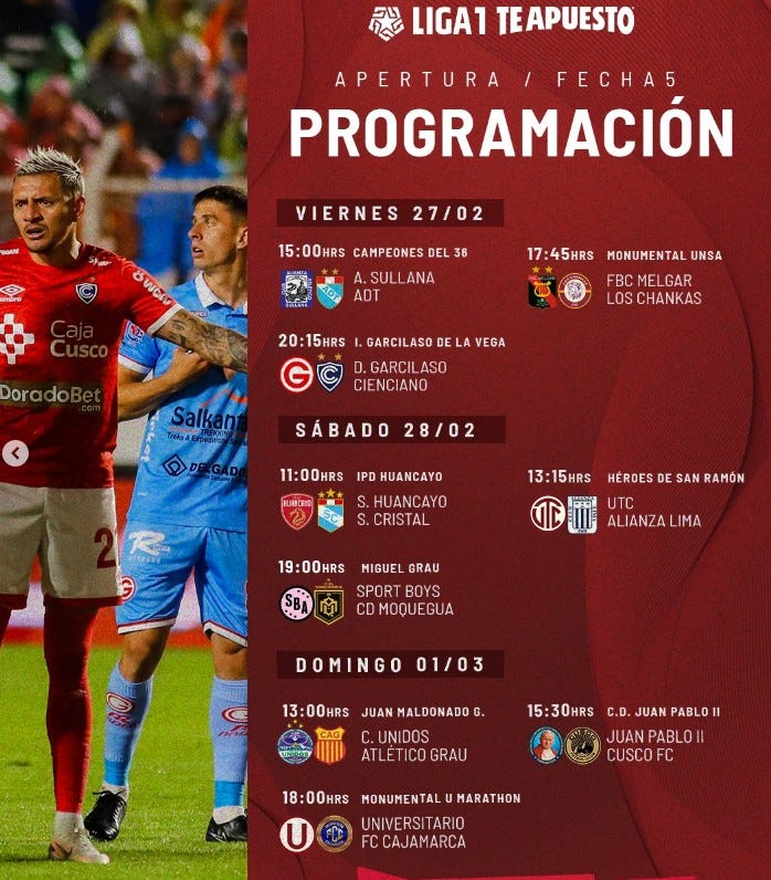 Conoce la programación de la fecha 5 del Torneo Apertura 2026. Alianza Lima visitará a UTC, mientras que Universitario recibirá a FC Cajamarca en el Monumental.