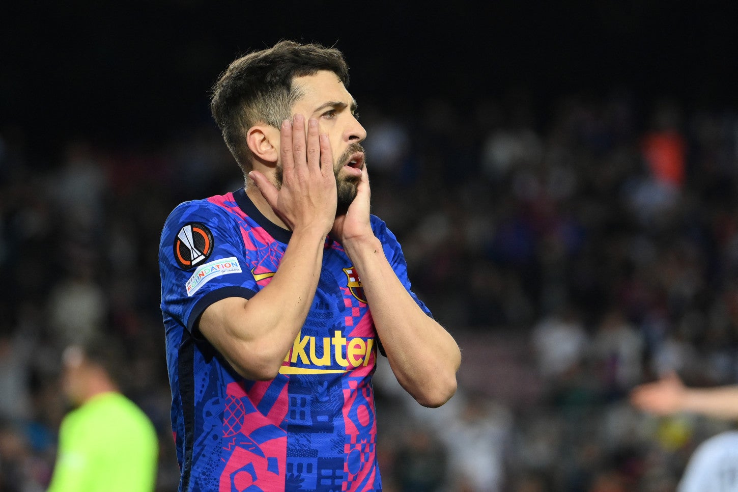 Jordi Alba no puede creer la derrota de Barcelona en casa ante el Eintracht Frankfurt.Fuente: AFP