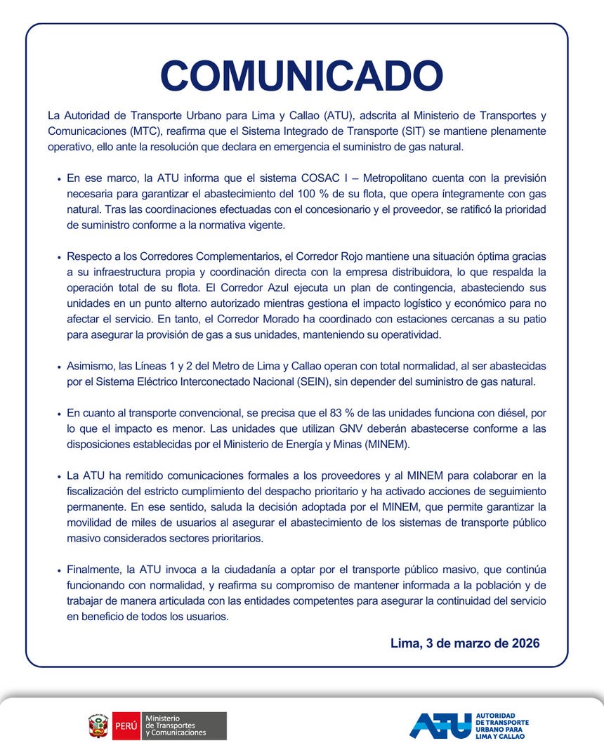 Ante la emergencia en el suministro del GNV declarada por el Ministerio de Energía y Minas (Minem), la ATU ha informado que el “Sistema Integrado de Transporte (SIT) se mantiene plenamente operativo”; es decir, los servicios del Metropolitano y los corredores complementarios continuarán laborando con normalidad.