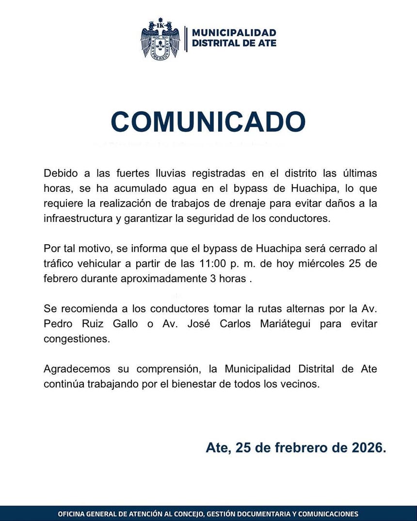 Ante la acumulación de agua y el riesgo para los usuarios, la Municipalidad Distrital de Ate dispuso el cierre temporal del bypass de Huachipa, ubicado en la avenida Ramiro Prialé. Esta medida se tomó para iniciar trabajos de drenaje urgentes y evitar daños estructurales en la vía, recomendando a los conductores utilizar rutas alternas como las avenidas Pedro Ruiz Gallo o José Carlos Mariátegui.