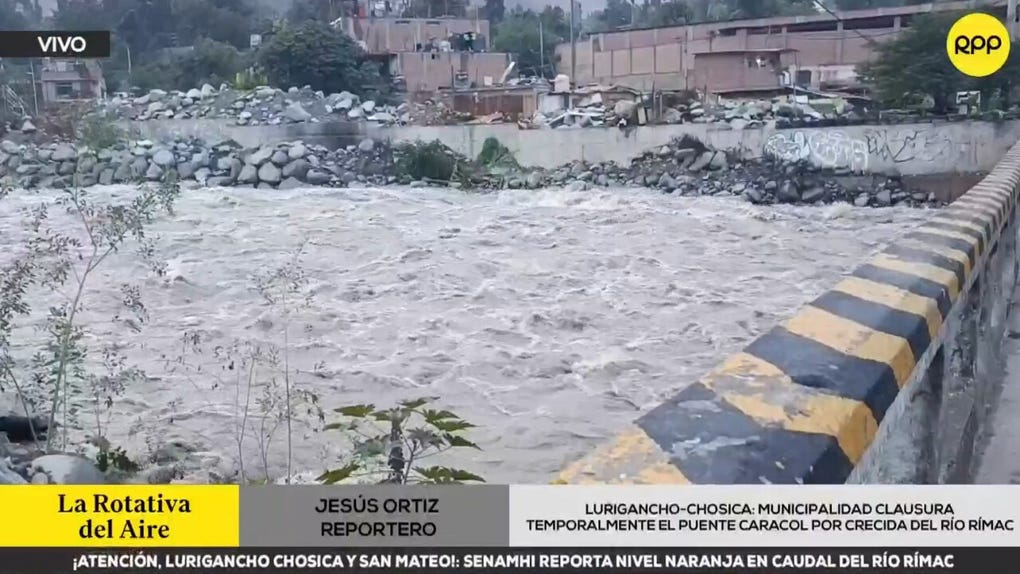 La Municipalidad de Lurigancho-Chosica dispuso la clausura temporal del puente Caracol, una importante vía de interconexión en el distrito, debido a la peligrosa crecida del río Rímac, cuyo caudal llegó a rozar la estructura metálica.