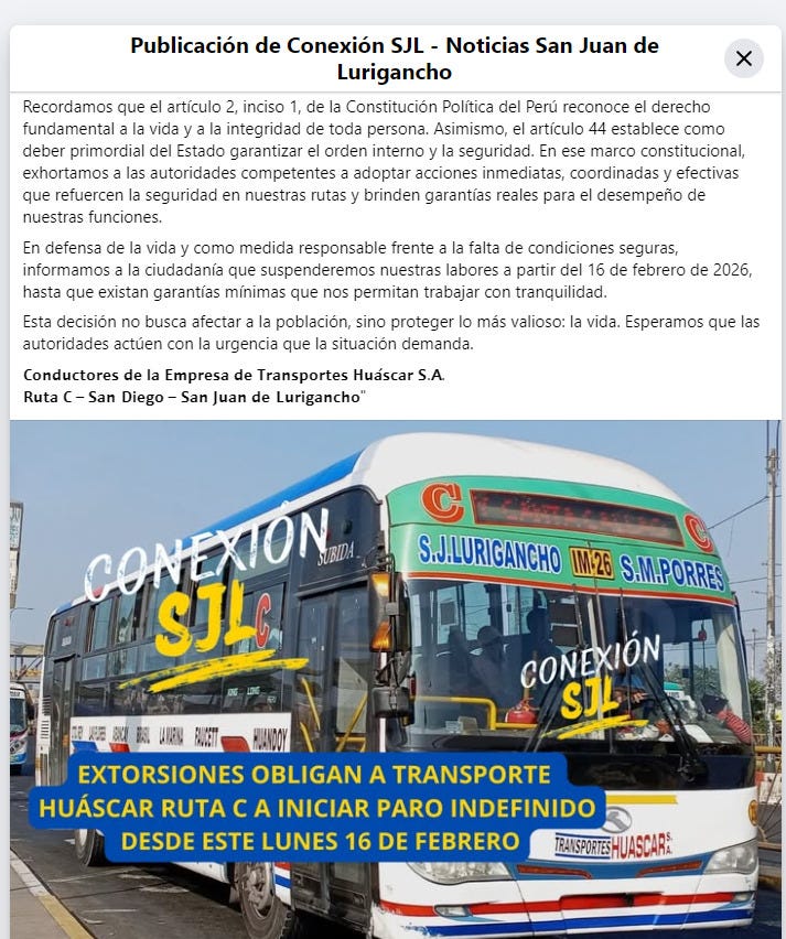 El grupo empresarial de transporte 'El Rápido' había anunciado la tarde del domingo 15 de febrero que paralizará su operación a partir de este lunes 16 de febrero, tras el asesinato de uno de sus conductores en el distrito limeño de San Martín de Porres.