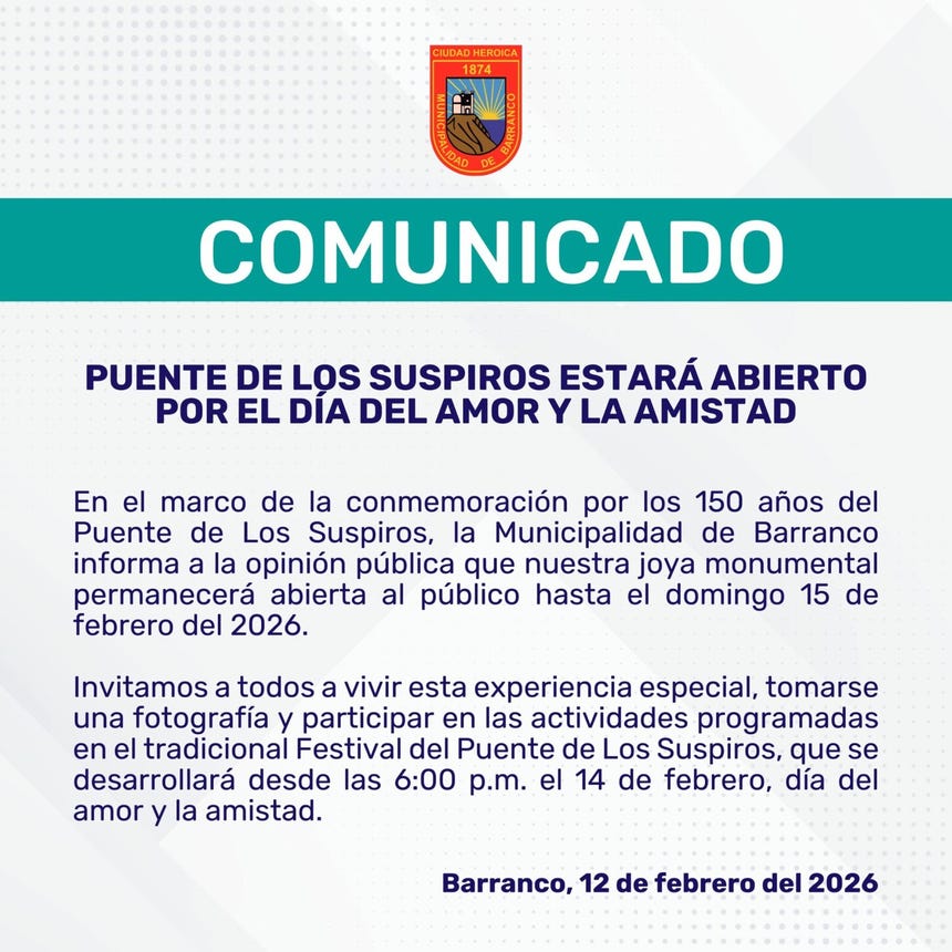 La Municipalidad de Barranco anunció a través de un comunicado que el Puente de los Suspiros permanecerá abierto al público hasta el 15 de febrero, por lo que los turistas y ciudadanos peruanos podrán visitar el monumento histórico este sábado 14, Día del Amor y la Amistad.