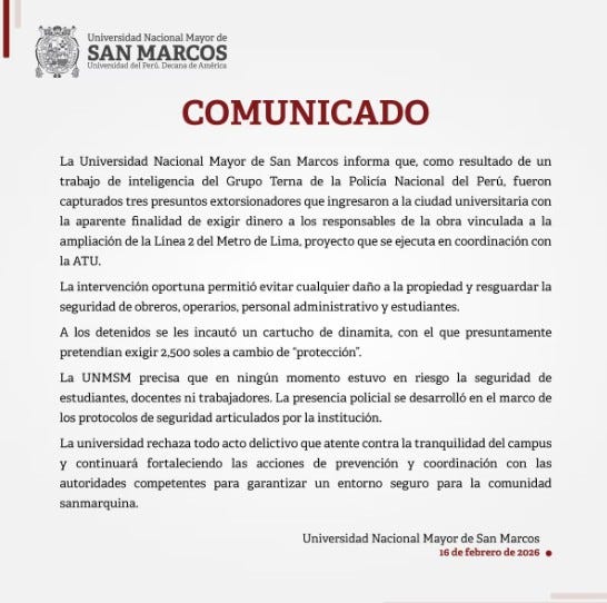 Esta casa de estudios, en contraste con lo que indicó la Policía Nacional, señaló que estos sujetos habrían querido extorsionar a los responsables de la ampliación de la Línea 2 del Metro de Lima, una obra que se realiza cerca al campus universitario.