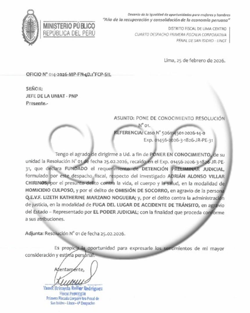 En un documento fiscal, al que RPP tuvo acceso, se consigna que la detención preliminar contra Adrián Villar se da en el marco de la investigación abierta en su contra “por el presunto delito contra la vida, el cuerpo y la salud, en la modalidad de homicidio culposo, y por el delito de omisión de socorro, en agravio de Lizeth Marzano Noguera; y, por el delito contra la administración de justicia, en la modalidad de fuga del lugar de accidente de tránsito, en agravio del Estado-representado por el Poder Judicial”.