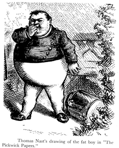“Un clamor de incesante golpeteo acosó el alojamiento de Mr. Pickwick. Una vez abierta la puerta se dejó ver de pie la figura de un muchacho de extraordinaria gordura con los ojos cerrados como si estuviera dormido por su expresión de calma y reposo. Preguntándole a qué venía, nada dijo, pero cabeceó una vez pareciendo roncar levemente; la repetición de la pregunta tres veces no obtuvo respuesta. Cuando estaba a punto de que le cerrara la puerta, bruscamente abrió sus ojos, parpadeó varias veces y elevó su mano en ademán de tocar de nuevo”.