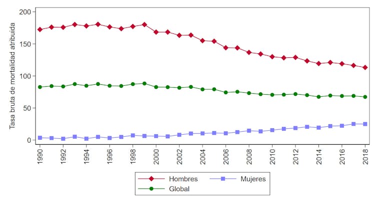Si se analizan en detalle los datos, ese descenso se debe a un claro descenso de la mortalidad atribuida al consumo de tabaco en hombres a cualquier edad a partir de finales de los años 90. Pero si nos quedamos solo con los datos de la población femenina, la cosa cambia radicalmente. Desde los años noventa, la mortalidad atribuida al consumo de tabaco en mujeres está aumentando, sobre todo por cáncer de pulmón y enfermedades cardiovasculares. Y lo hace rápido tanto en las jóvenes como en las de edad más avanzada.