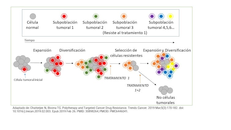 Claramente esto es mucho más complejo. Pero hay una estrategia prometedora para atenuar de una manera más efectiva la resistencia a los medicamentos y aumentar la supervivencia del paciente. Consistiría en administrar una terapia inicial combinada que prevenga o retrase la evolución de los tumores y/o cambiar dinámicamente dicho tratamiento durante la respuesta tumoral antes de que surja completamente la resistencia.![]()