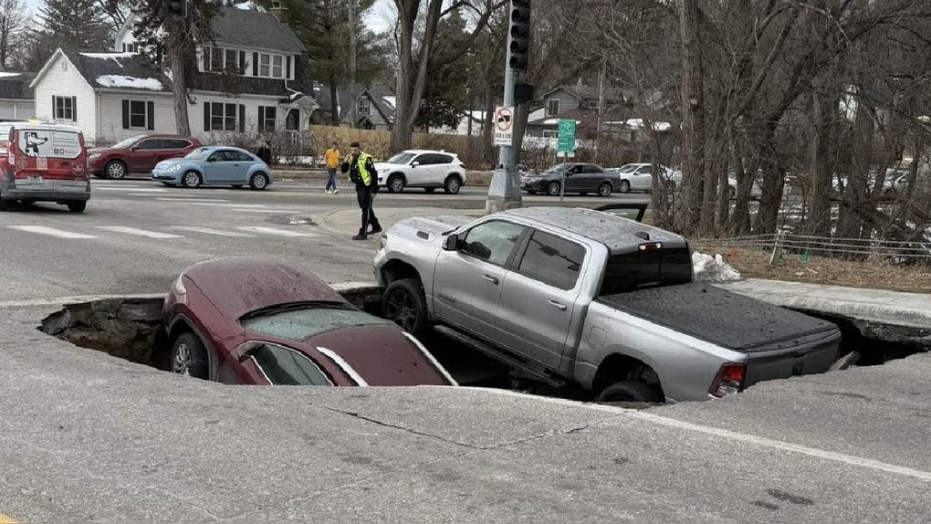 De no creer. Dos automóviles cayeron en un socavón que se abrió de forma espontánea en una carretera de la localidad estadounidense de Aksarben, en la ciudad de Omaha (estado de Nebraska).
