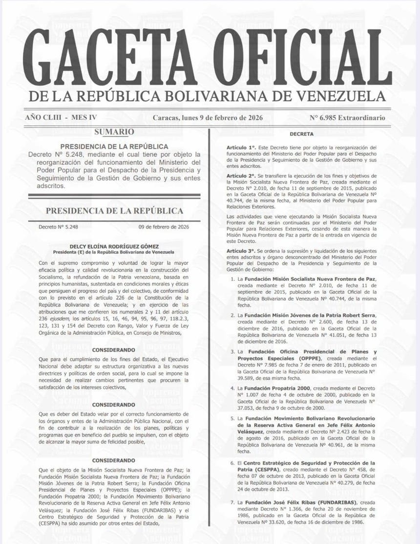 En el marco de una reorganización del Despacho Presidencial, Delcy Rodríguez, actual encargada del Ejecutivo en Venezuela, ordenó la supresión y liquidación de seis misiones sociales a través de un decreto publicado en la Gaceta Oficial.
