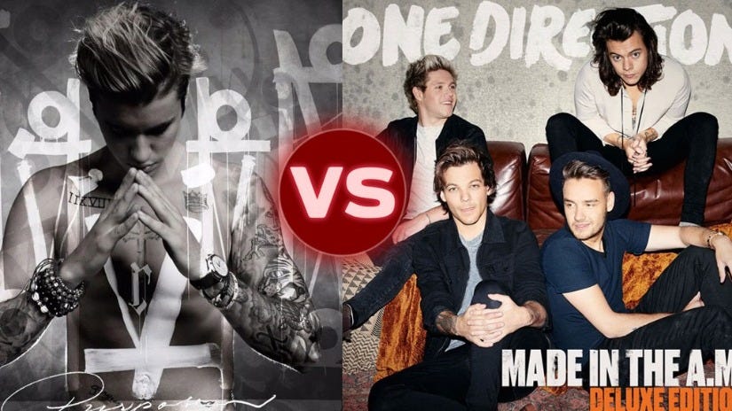 Los dos productos más rentables de la industria musical: One Direction y Justin Bieber; estrenan este viernes 13 de noviembre sus nuevos trabajos discográficos. ¡La batalla está declarada!