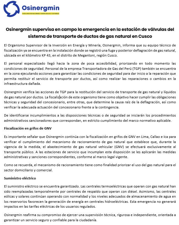 Asimismo, señaló que el equipo técnico de Osinergmin se encuentra en la zona fiscalizando a la concesionaria TGP, con el fin de que ejecuten las actividades con seguridad establecida en la normativa vigente y para verificar que realice las acciones correspondientes, a fin de determinar la causa raíz de la deflagración y garanticen la restitución del servicio oportunamente.