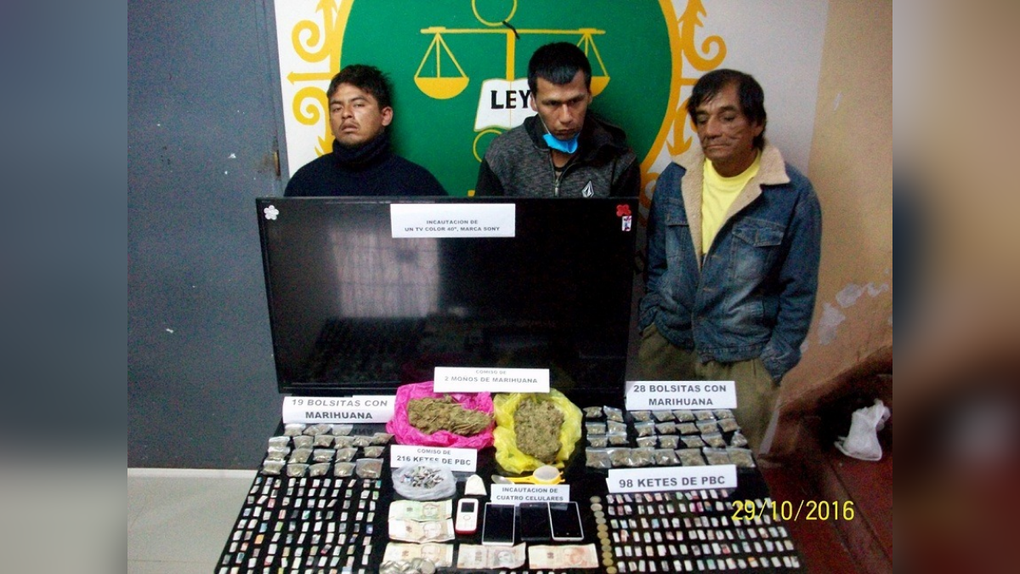 Ahí fueron intervenidos Julio Balladares Berna (65), alias ‘Calcioral’; Mario Jesús Viena Limo (25), alias ‘Jeshu’ y Luis Eduardo Reyes Urcia (25), alias ‘Fuji’. También se encontraron bolsas con marihuana, celulares, dinero en efectivo, una televisión LED de 40 pulgadas, una bolsa de cocaína, más de 200 envoltorios de PBC, entre otros.